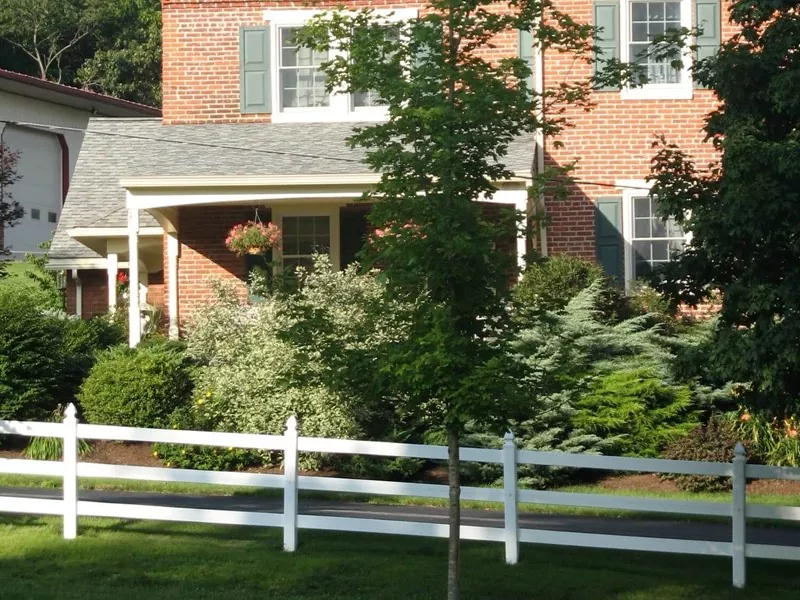 ● Ландшафтный забор жилого комплекса: белые столбы из ПВХ в сочетании с горизонтальными перилами и зеленью создают классическую границу в английском или американском стиле.