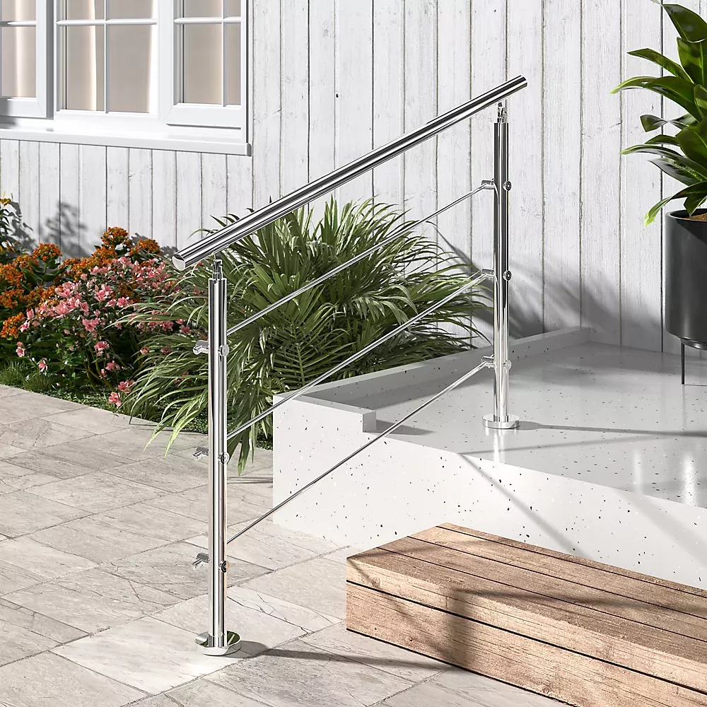 Нержавеющие лестничные перила Vionta, изготовленные из высокопрочной нержавеющей стали, прочны и долговечны и эффективно предотвращают скольжение. Хромированная отделка делает их устойчивыми к атмосферным воздействиям и коррозии. Эти поручни просты в обслуживании; просто протрите их тканью или промойте водой. Центральная перекладина удобна для детей и повышает устойчивость поручня.