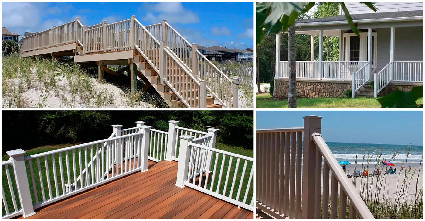 Виниловые перила — популярная и не требующая особого ухода альтернатива дереву, изготовленная из прочного ПВХ. Он разработан, чтобы противостоять гниению, насекомым и погодным повреждениям без необходимости покраски или окрашивания, широко используется для террас, балконов и открытых пространств.